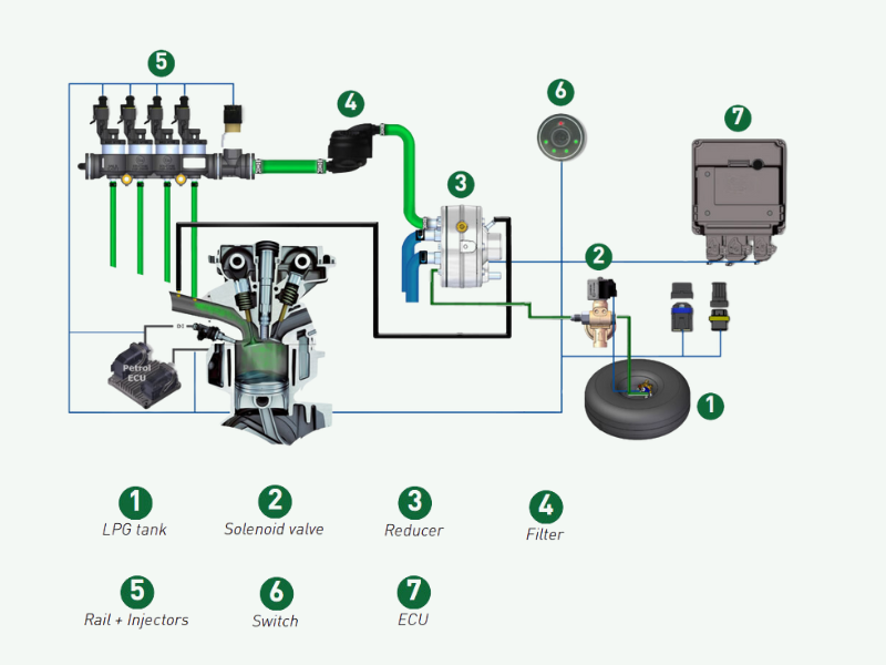 To adapt a vehicle to LPG, a conversion kit must be installed, which consists of the following elements